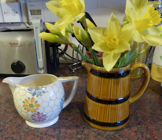 The floral jug was £4 and the quirky barrel one £1.99, I just had to put daffs in it. (yeah that's my toaster in the background! I'm all about classy settings me.)